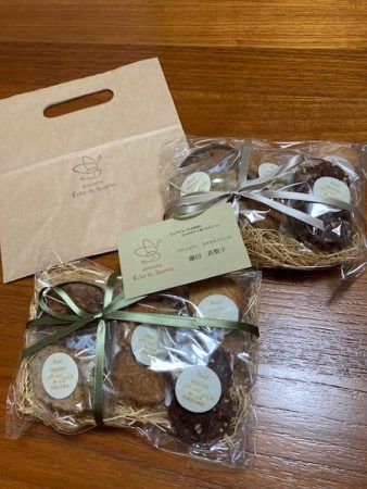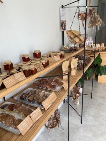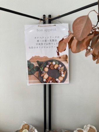 店内に入ると雑貨屋さんのような柔らかい雰囲気。 左手には焼き菓子。 その中でも中央の丸いシールが貼られているものは、卵・小麦粉・乳製品が使用されていないボナペティシリーズ。 以前働かれていたお店で、小麦粉アレルギーのお子さんを持つお母さんに”小麦粉を使用していないお菓子はありますか” と訊ねられ、当時対象品が無かったことがずっと気になって誕生した商品だそう。
