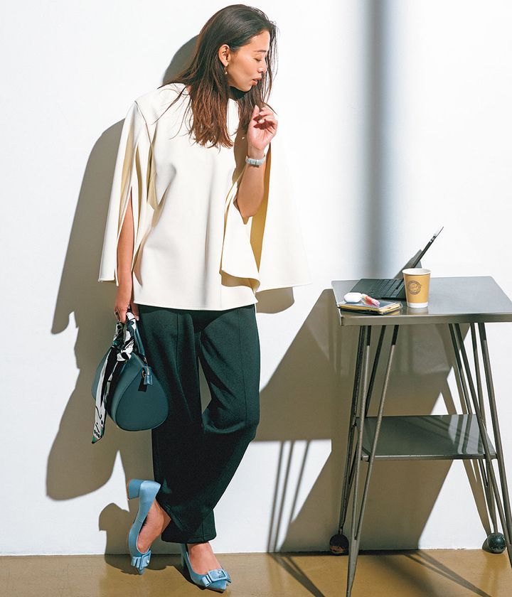 ブラウス〔紫外線防止〕¥27,500(LE PHIL/LE PHIL NEWoMan 新宿店)パンツ¥14,300(オー・ゼロ・ユー/アドアーリンク)バッグ¥25,300(アンタイトル)スカーフ¥9,900(マニプリ)パンプス¥31,900(ツル バイ マリコ オイカワ)ピアス¥18,040(ジゼル・ベー/ZUTTOHOLIC)時計¥16,500(クルース)リング¥141,900(マリハ)