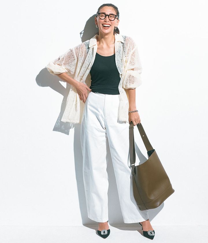 シャツ¥39,600(ジェーン スミス/プラージュ 代官山店)ブラトップ〔吸湿、放湿、速乾〕¥2,200(アセドロン/グンゼ)パンツ¥12,100(マルゥ ユナイテッドアローズ/ユナイテッドアローズ カスタマーサービスデスク)バッグ¥22,550(アンドミューク/アマン)パンプス¥39,600〈トニービアンコ〉ピアス※店舗限定¥19,800〈フィリップ オーディベール〉(ともにアンタイトル)ブレスレット¥6,600(エイチアッシュ/フォーティーン ショールーム)メガ ネ¥42,900(アイヴァン /アイヴァン 東京ギャラリー)