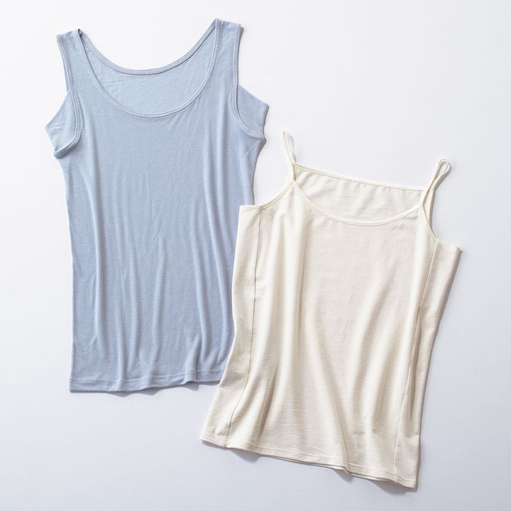 〈右から〉吸水性に優れた和紙素材。キャミソール¥5,940(アンダーソン アンダーソン)珪藻土に着想を得た汗のあらゆる不快を消し去る吸湿速乾機能。汗取り付きタンクトップ¥1,650(アセドロン/グンゼ)