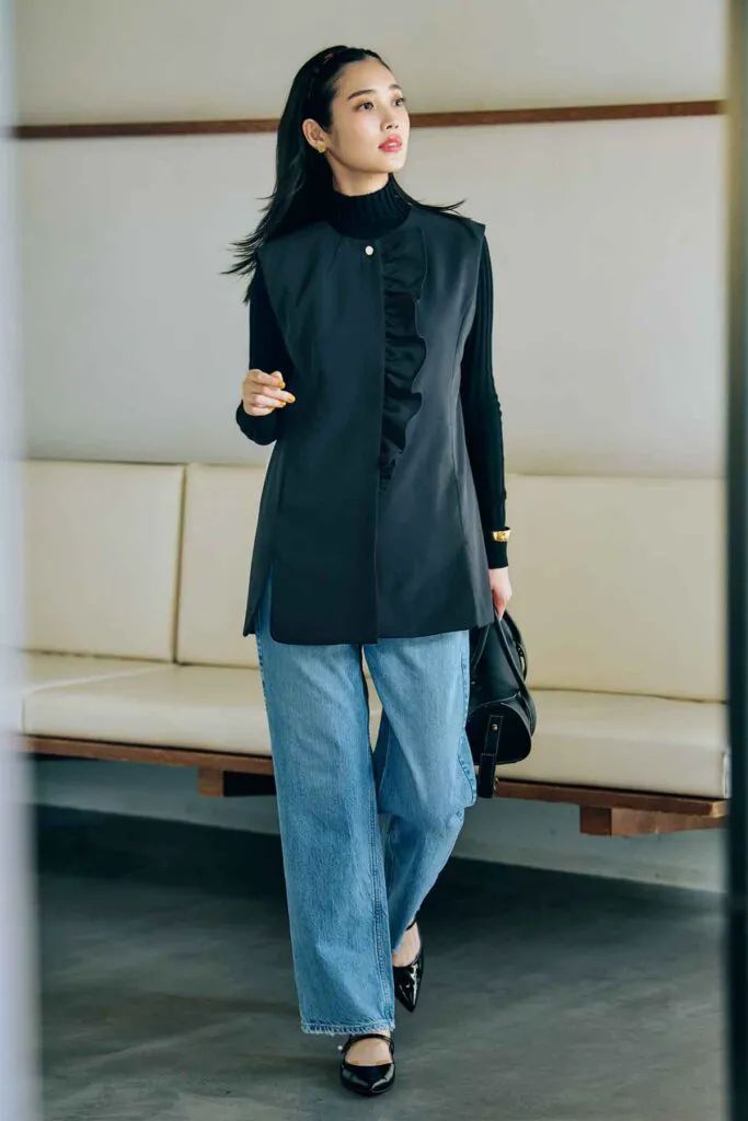 普段シンプルコーデが多いという人にこそおすすめなのが、ひと癖デザインのジレ。一点投入するだけで、黒ニット×デニムのワンツーコーデが一気に華やぎます。エナメル素材のパンプスで、足元に色っぽさを足すのが上級者見えのコツ。