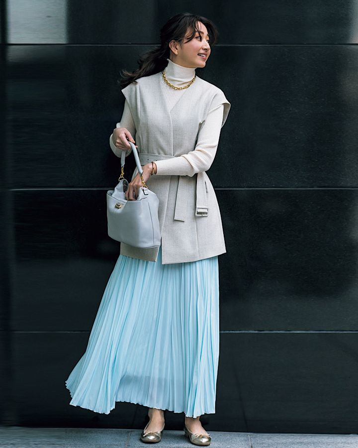 3月31日(木)、この春トレンド大本命の「ジレ」は、リネン素材×ベルトつきにアップデート。フレンチスリーブなので、華奢見え効果が期待できそう。ニュアンスカラーでまとめた上半身には、ライトブルーのプリーツスカートで華やぎを添えて。