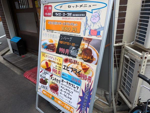 ランチタイムが11時から15時までです。15時まではすごいですね。定番のメニューは、手作り手ごねハンバーグが990円、エビフライが990円、昔ながらのオムライスが990円、メンチカツが1430円、タンシチューが3300円。本日の日替りサービスランチセットは880円です。今回はこのお得な日替りサービスランチセットをご紹介します!