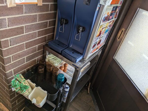 入口に、おしぼり、割り箸、麦茶のセルフサービスで用意されています。