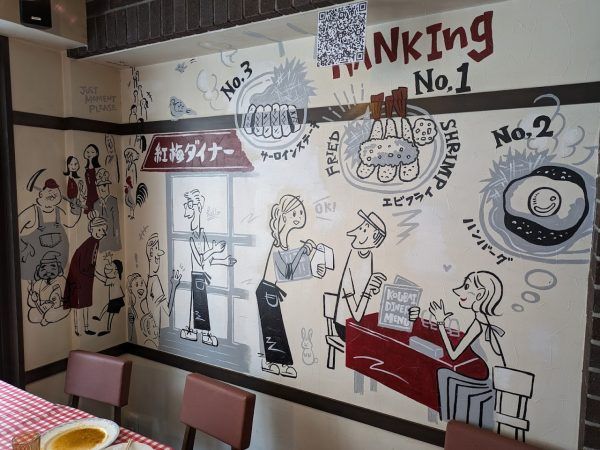 テーブル席側の壁紙にはポップな注文を受けるスタッフさんのイラスト。テーブルには赤と白の大きめのチェック柄のクロスが掛けてあります。可愛いですね。