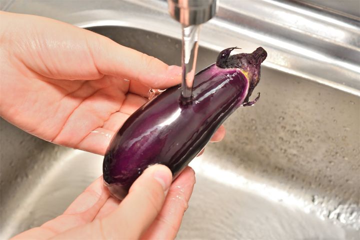 1. なすを流水で洗う。