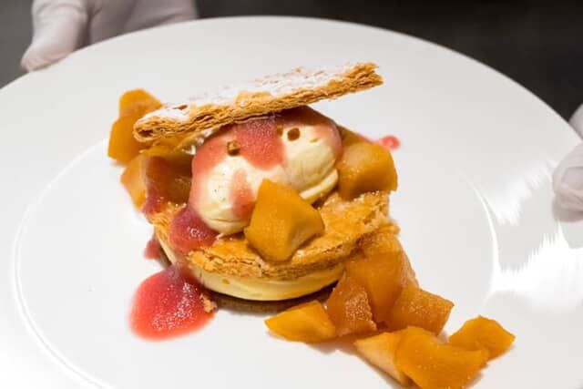 3つのフィナンシェの上には、生クリームやバターディスク、オリジナルアイスを重ね、最後にアーモンドを削って完成です。