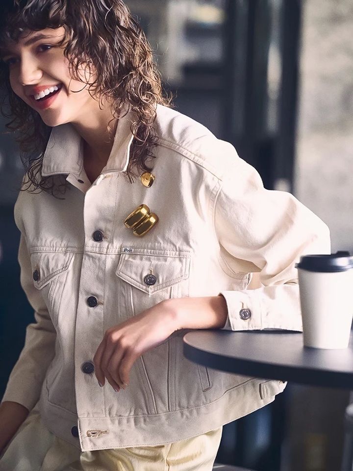 白とクリームイエローの穏やかな配色に寄り添いながら、適度に主張する大ぶりブローチをランダムに2個づけ。ジュエリーよりも型にはまらないラフな使い方を楽しめる。