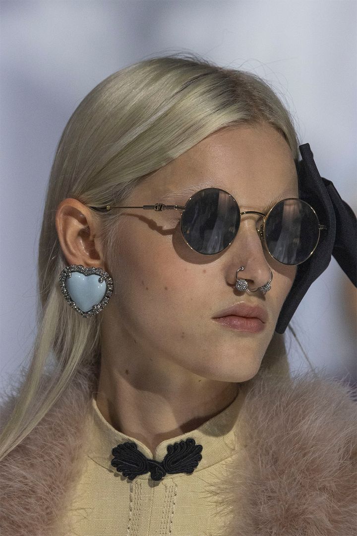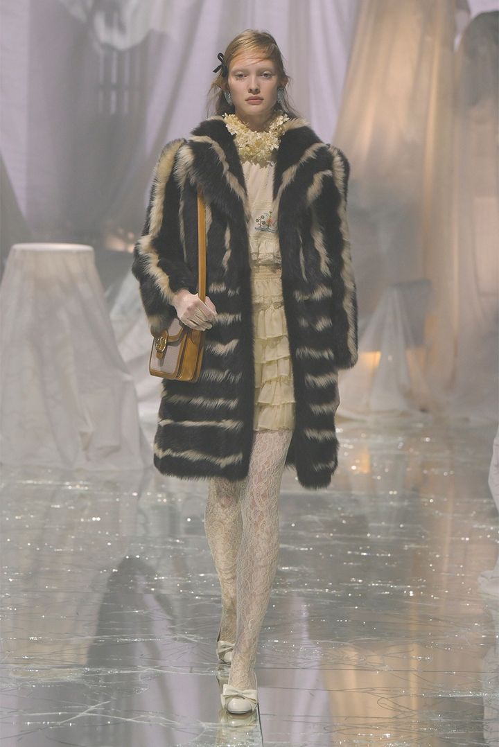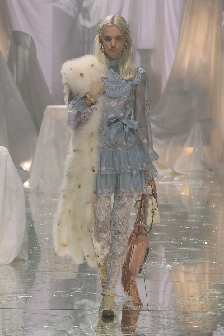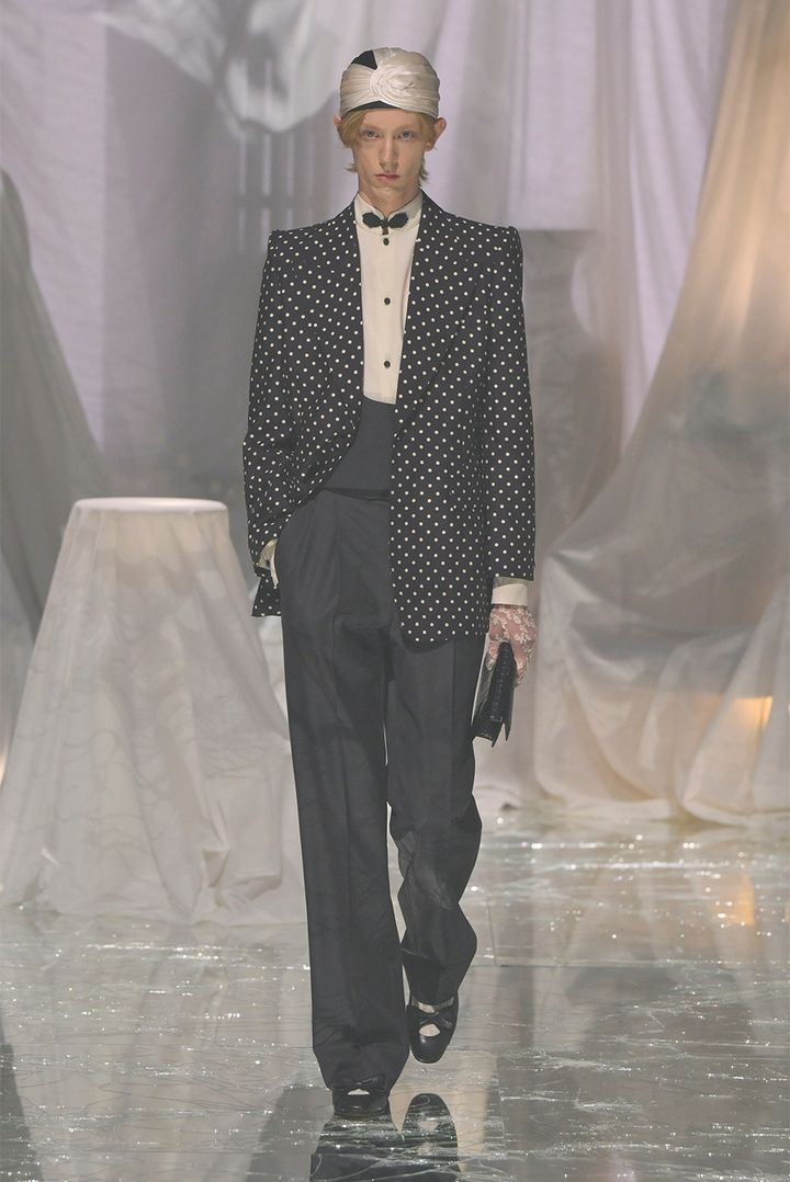 ランウェイを包み込んだのは、ブラウスやドレスに配された軽やかに揺らめくラッフルをはじめ、フロントに大きく装飾されたリボン、ドット柄のジャケット、レースのグローブやソックスなど、ゴシックなエッセンスを散りばめたロマンティックなムード。