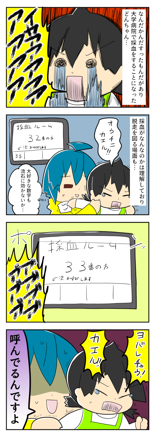 採血が何かを知っているからこそ感じる恐怖ですね。どんちゃん、頑張れー!