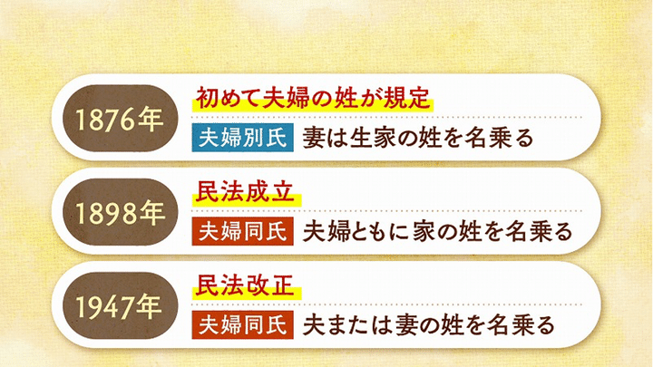 そもそも、1876年に日本で初めて夫婦の姓が規定された時には「夫婦別氏」でした。