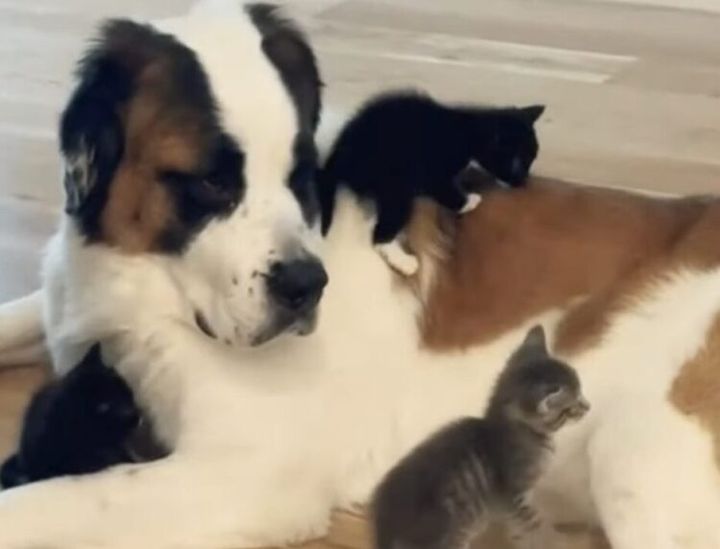 大型犬「山だと思われているかな?」 子猫の遊びに付き合ってあげる♪