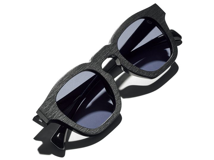 イタリアのセルロースアセテートを使用し、フロントをフラットにすることで、エッジーなフォルムを強調している。独自のヘアライン加工も印象深い。