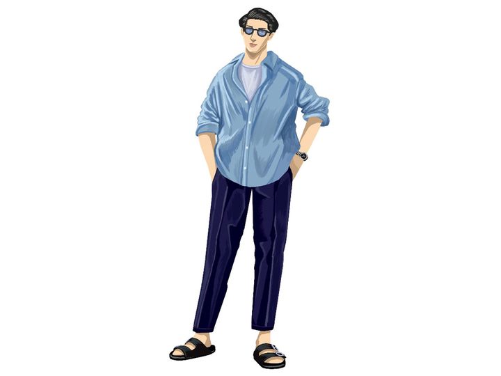 ゆったりめシャツのボタンを半分開ける&スラックスの丈は短めと、抜け感を演出するアレンジが随所に光る。