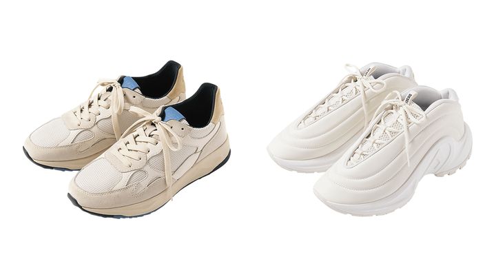〈左〉LAブランドのスニーカーは、トーン違いのベージュを組み合わせたこなれた一足。〈右〉スムースなフォルムが近未来的なムード。まろみのあるオフホワイトも合わせやすい。