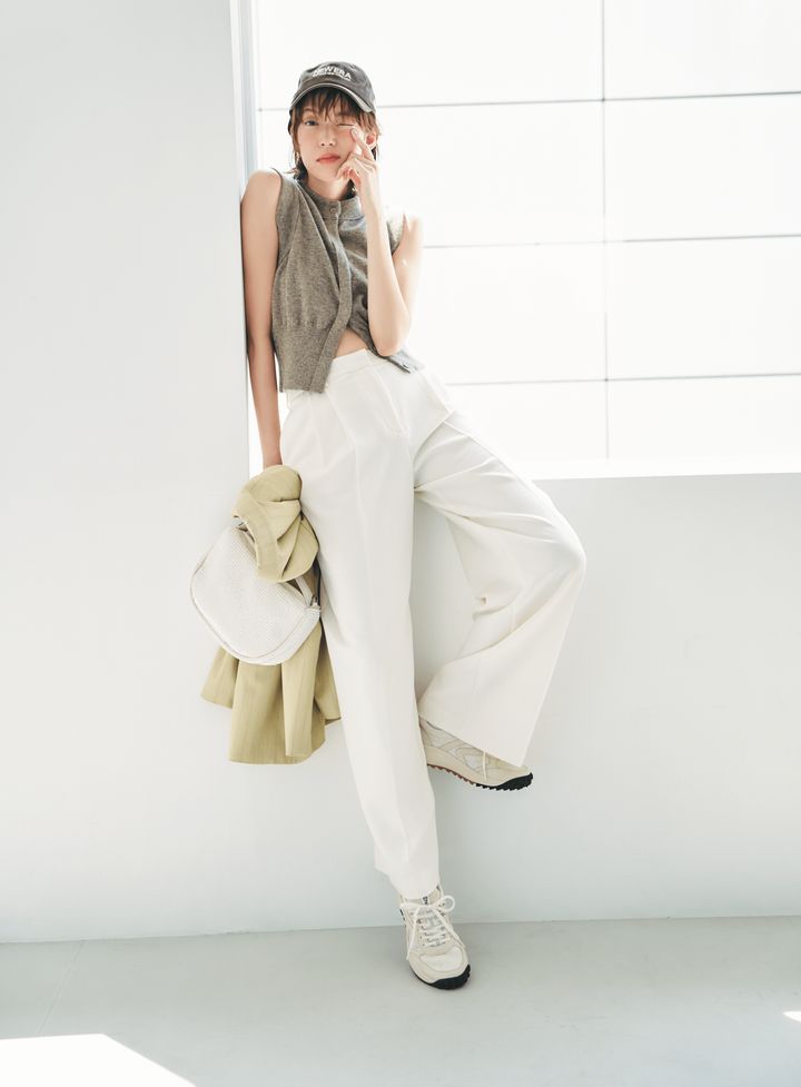 明るいベージュのスニーカーは、コーデに軽やかさと抜け感をプラス。ソールが厚くてこっそりスタイルUPできるのも良き♡ きちんとした印象のスラックスコーデも、スニーカーやキャップでカジュアルダウンがシャレてる♪