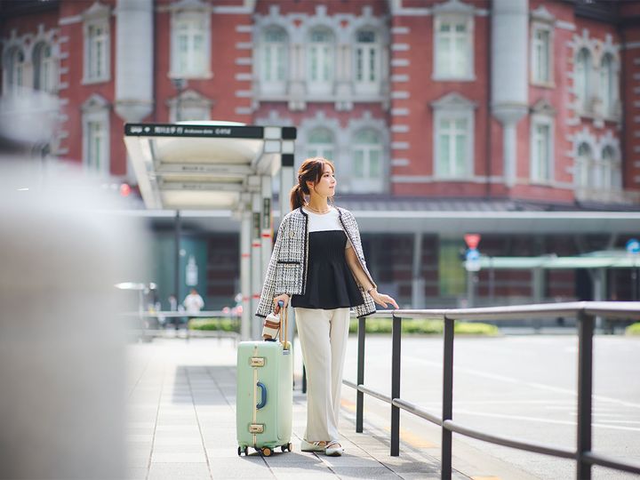 トップス¥17,600/ジャスグリッティー ジャケット¥19,990 、パンツ¥ 9,990/ともにイェッカ ヴェッカ (イェッカ ヴェッカ 吉祥寺) シューズ¥ 2,990/神戸レタス バッグ(ショルダース トラップ付き)¥5,990/ZARA(ザラ カ スタマーサービス) キャリーケース¥48,400/Hant(エース) ピアス¥16,500/アンテプリマ(アンテプリマ 新宿髙島屋店) ネックレス¥7,920/アプロ、 バングル¥22,000/masae(ともにロードス)