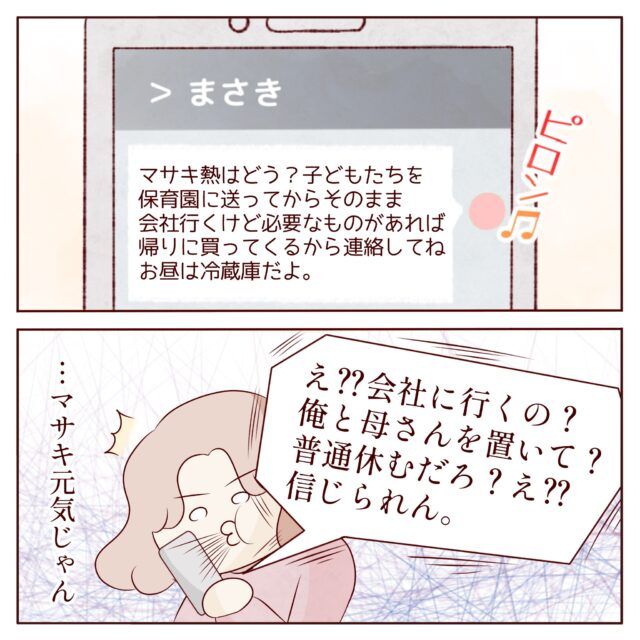 すると「え??会社に行くの?俺と母さんを置いて?普通休むだろ?え??信じられん。」と返事がきました。モエさんは「・・・マサキ元気じゃん。」と心の中でつぶやきました。
