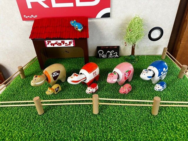 「酪王牛乳」「酪王カフェオレ」「酪王いちごオレ」「のむのむヨーグルト」「農協牛乳」をモチーフにした、色とりどりの赤べこが誕生しました。