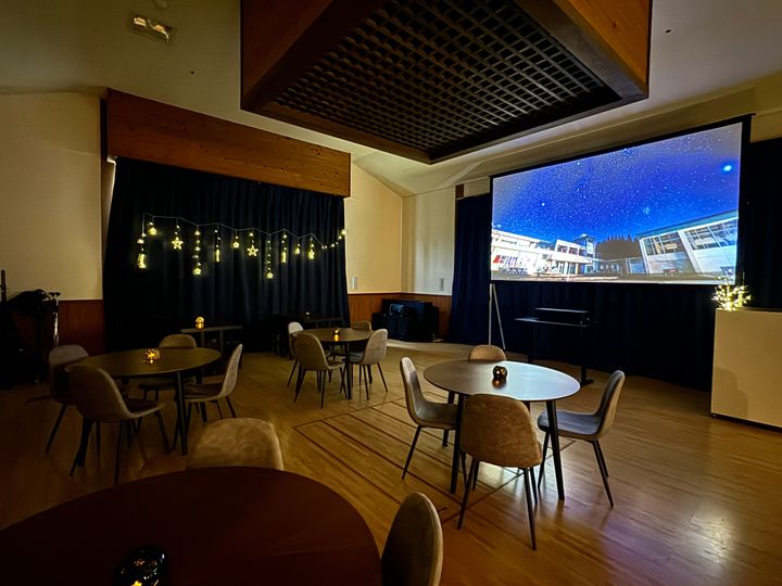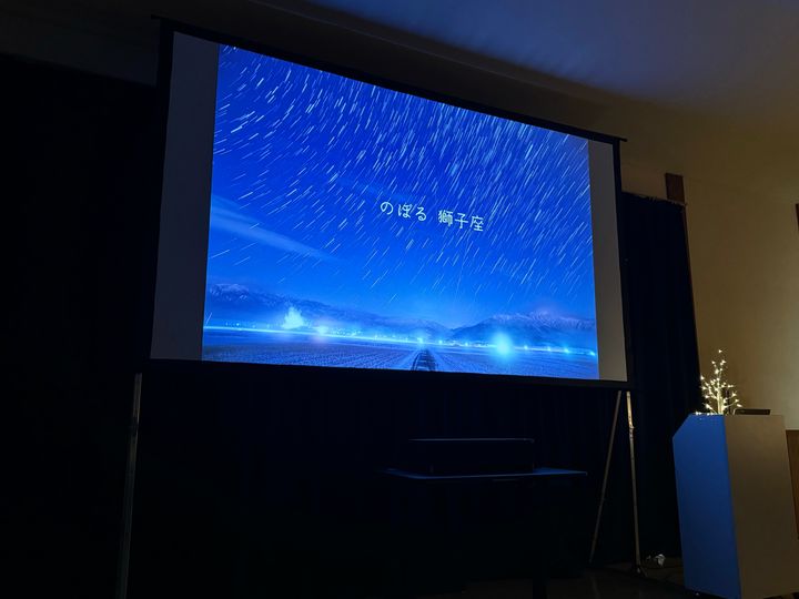 150インチの大きなスクリーンでは、大野市の星空、世界各地の美しい星空、天の川、オーロラなど、絶景の星空映像が流れています。