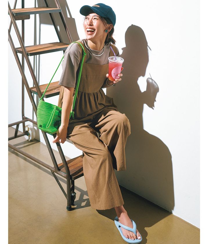 Tシャツ〔接触冷感、吸湿性、吸汗性〕¥5,390(エルーラ/アダストリア)サロペット〔接触冷感〕¥30,800(アルページュストーリーオリジナル)バッグ¥47,300(ステート オブ エスケープ/リトルリーグ インク)サンダル¥6,812〈TAW&TOE〉キャップ¥4,974〈SIENNE〉(ともにムシンサ グローバル ストア)サングラス¥47,300(アイヴァン/アイヴァン 東京ギャラリー)イヤリング¥12,100(マージョリー・ベア/ココシュニック新宿タカシマヤ店)ネックレス¥71,500(ウノアエレシルバーコレクション/ウノアエレ ジャパン)ブレスレット※店舗限定¥30,800(フィリップ オーディベール/アンタイトル)