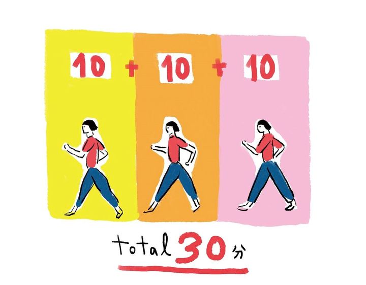 最終的に「一日30分」まで延ばしていくことを目標に。その場合、「15分×2回」「10分×3回」など、分けて歩いてもかまいません。