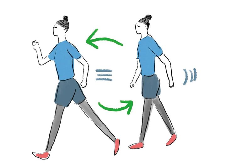 30分の中で運動強度を高めていくと、自然と距離が延びてきますが、一方で長距離をずっと速いスピードで歩きつづけるのはつらくなってきます。そこで取り入れたいのが、「インターバル歩行」。「速歩」と「ゆっくり歩き」を交互に繰り返すことで心肺に負荷をかけ、「目標心拍数」を維持しながら長い距離を歩けるようになります。