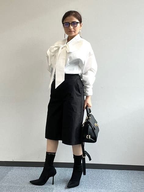キレイめなハーフパンツとあわせ、大きめリボンの甘さとかっこよさをMIXした甘ニッシュスタイル。ハーフパンツが、大人な余裕を感じるSTORY 世代のこなれたオフィススタイルに。靴下を合わせるのもモードな雰囲気になりオススメです。こちらのリボンブラウスは、トレンドのショート丈とボリュームのある袖口がエレガントすぎない旬なキレイめスタイルを叶えます。タイはリボンにしたり、垂らしたりと雰囲気を変えるのも◎。
