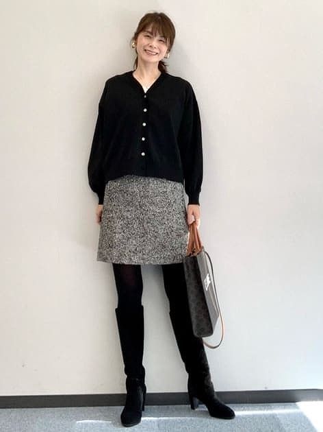 前から見るとVネックのシンプルめなニットカーディガンとツイードミニスカを用いた大人可愛い秋コーデ。後ろから見るとヨーク下に共布とチュールが重なった長めのフリルが施されているのが魅力的なカーデを使用。素材は薄くなく厚くなくちょうど良いハイゲージに。シルエットも少し丸みと前後差を感じるのでなんとなくカジュアルな抜け感です。
