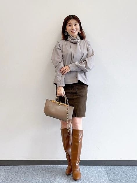 秋のおでかけコーデに最適なボウタイブラウスをチョイス。どの色も使いやすいですが、特にグレーはハンサムさがあるのでミニスカなどと合わせてもコーデが辛口に引き締まります。丈はアウトしても決まる長過ぎないデザイン。意外と裾をアウトできるボウタイブラウスって見かけないので、アウトしたい方にもおすすめのアイテムです。