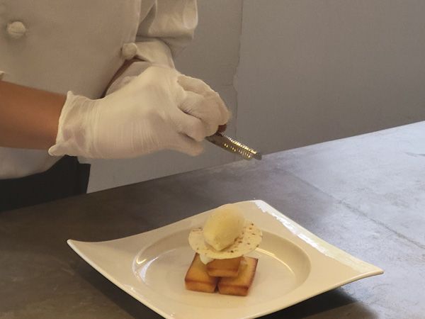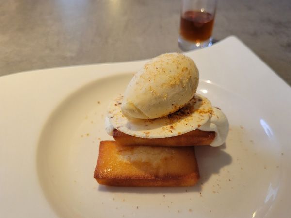 温かいフィナンシェに、生クリーム、バターディスク(バタークリーム+キャラメリゼしたアーモンド)、アイスクリームを飾った繊細なデコレーション。