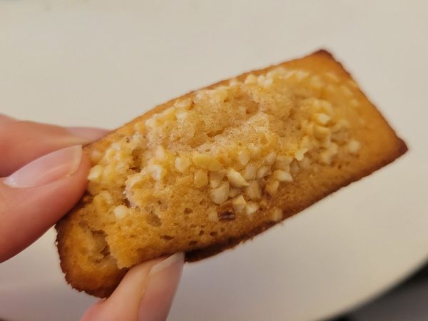 特別に焼き立てをいただきました! 手で持つとたゆんでしまうほど柔らかで、フィナンシェのやさしい甘さがふんわりと口いっぱいに広がります。ナッツ香ばしい香りの余韻を感じられるおいしさです。リッチな気持ちにさせてくれます。