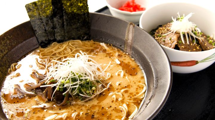 『濃厚とんこつラーメンと和牛ミニステーキ丼』は3日間かけて豚骨と野菜、果物の旨味を引き出したスープが自慢(ラーメン替え玉注文可)
