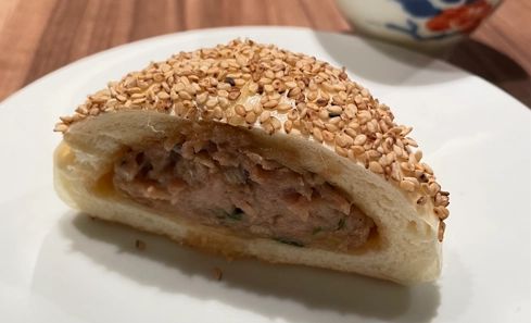 こちらは台湾の屋台料理でも人気の胡椒餅。その名のとおり、胡椒が効いた豚肉の餡をもっちりした厚めの生地で包んでいます。でもこれ、普通の肉まんじゅうとは違うんです!