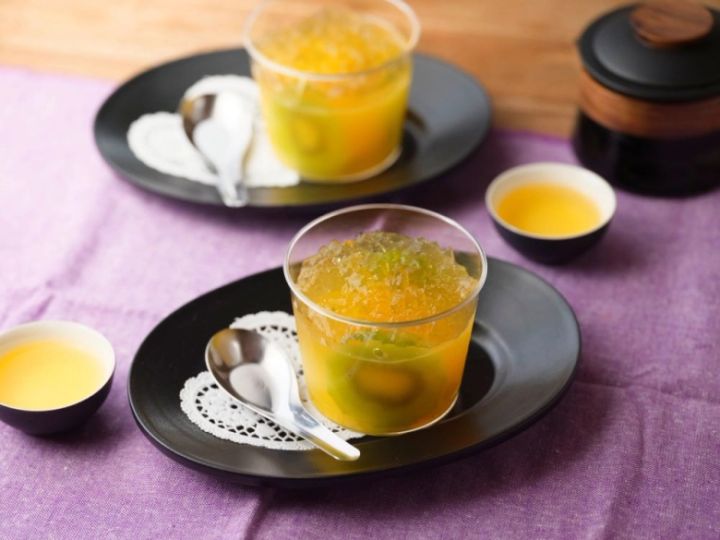 台湾凍頂烏龍茶のゼリーに、大きくカットされたパイナップル、オレンジ、キウイが贅沢に盛り込まれたデザートで、爽やかな香りと味が楽しめます。量もたっぷりなので、デザート好きさんにはたまりませんね。上部にはジャスミンゼリーがのせられていて、台湾フルーツティー(水果茶)をイメージさせる仕上がりです。