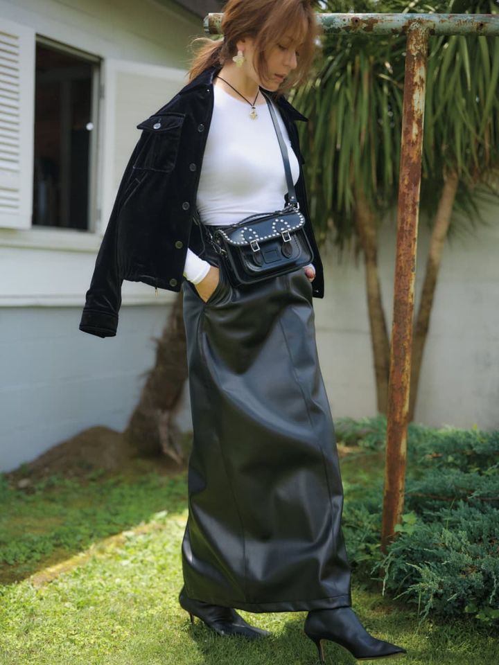 パンツ一辺倒だったオトナの女性界隈も、スカート購入欲が上昇中。レディなムードではく、タイトラインのロングスカートはひとつあると重宝しそう。レザー素材なら一層トレンド感が出せますよ。