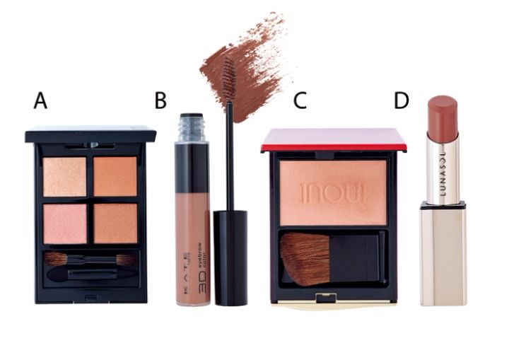 ブラシにCをとり、ほお骨をなぞるようにふんわりとのせる。目元とチークを淡いトーンでまとめたので、リップは同系色でも少しダークなDを塗って顔の印象を適度に引き締める。