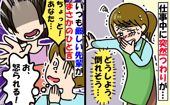仕事中に突然つわりが。しかし、そのとき一緒に働いていたのはいつも厳しくて避けてしまっていた先輩……。先輩には「その接客だと売れるものも売れないわよ」「もっとはきはき話さないと!」とよく怒られていたので、冷たい人だという印象を持っていました。相談してもきっと「もっとしっかりしないと」と言われるだけろうな……と思い、つらいとも言えず頑張って立っていましたが、だんだんと視界がぼやけて冷や汗がとまりません。ついには吐き気もでてきて倒れそうに。