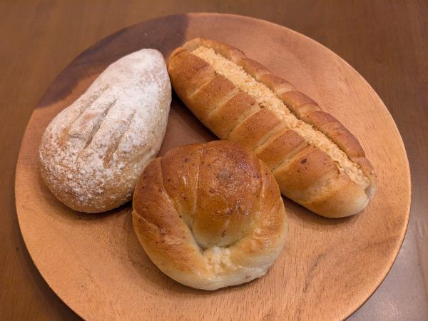 右から時計回りに「ピーナッツコッペ180円」、「オリーブオイルの塩パン160円」、「クリームチーズと無花果のカンパーニュ350円」。