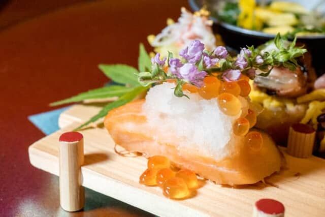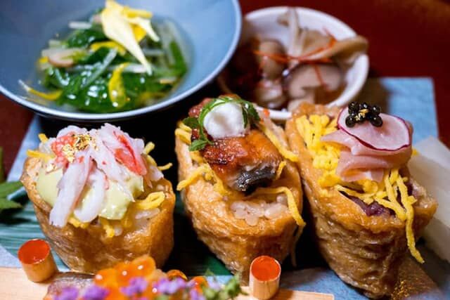 3種類並ぶ一口サイズの稲荷寿司は彩りに錦糸卵を乗せ、それぞれが個性たっぷり。青しその混ぜご飯には、アボカドをすり潰したワカモレに蟹を乗せ、金箔を飾ります。かやくの稲荷は鰻の蒲焼にとろろをプラス。黒米の稲荷は生ハムとキャビアをトッピング。頬張るたびに、多彩な味が口の中に広がります。