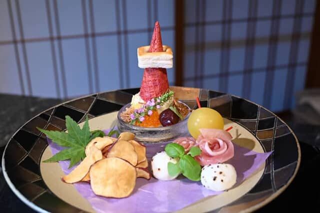マヨネーズ風ドレッシングで和えた優しい味わいのスイートポテトサラダに、東京タワーに見立てた赤いビーツコーンをトッピング。バラの花を模した生ハムや、モッツアレラチーズを使ったお団子スタイルのカプレーゼを飾り、さつまいもチップスを添えるなど、東京タワーの秋を彩るサラダです。