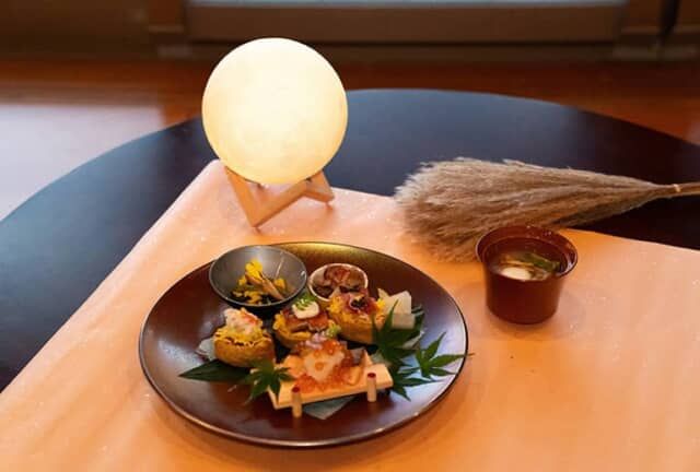 室内席を予約するプランには、1ドリンクと事前予約制のメインディッシュ「TOWER BAR おばんざい」を用意。「一口稲荷」や「茸のポン酢和え」、「柚子大根」のほか、白玉を雲の合間から見えるお月様に見立てた「滑子と白玉のみぞれ椀」など、秋の夜空を料理で楽しむ趣向です。