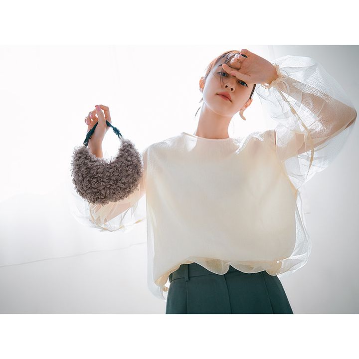 ほどよい煌めきのあるラメ感や絶妙なハリ感がワンツーコーデをグッと格上げ。袖の透け感やボリューム感は、年末に向けイベントが増える時季も活躍してくれそうな華やかさ。
