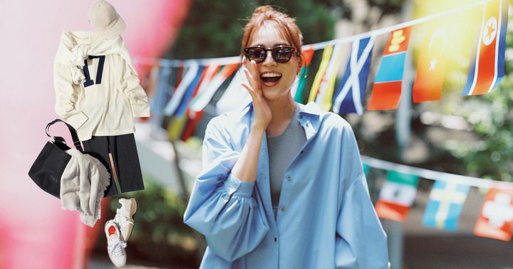 シャツ¥30,800(ル フィル/ル フィル ニュウマン新宿店)ブラトップ¥11,000(ポロ ラルフ ローレン/ラルフ ローレン)バイカーショーツ¥7,500(ルルレモン)ピアス¥22,000(ブランイリス/ブランイリス トーキョー)リング¥40,700(リューク)サングラス¥68,200(AHLEM/グローブスペックスエージェント)バッグ¥26,400トートバッグ¥13,200(ともにSEA/エスストア)