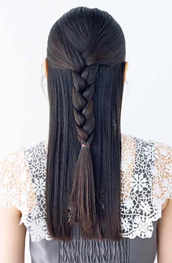 耳の位置から編み始めて、毛束を引きながらタイトな三つ編みにする。毛束の半分ほど編んだらゴムで結ぶ。