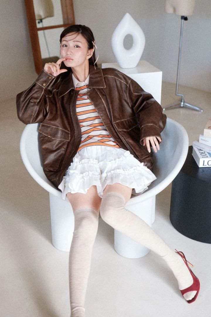 ブラウンレザージャケット 25,960円、ラガーニット 12,980円、ギャザースカート 12,980円/以上LILY BROWN ミュール 17,600円/ダイアナ(ダイアナ 銀座本店) ソックス/スタイリスト私物
