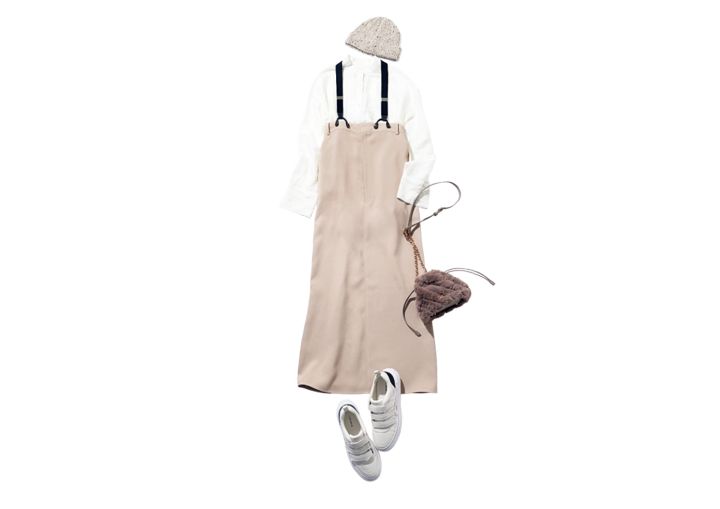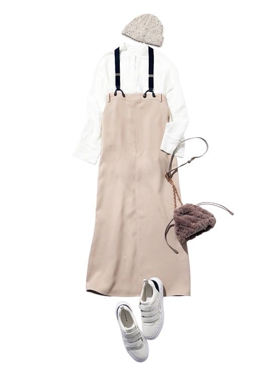 ドロストシャツ¥18,150/リエル リシェ サスペ付きジャンスカ¥24,200/リエル リシェ スニーカー¥25,300/ルーニィ ファーバッグ¥13,200/ノエラ ニットキャップ¥4,400/リエル リシェ