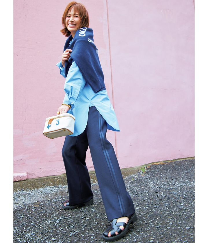 今季注目のラインパンツは控えめな同色ラインなら大人も取り入れやすく。仕立てのいいシャツに合わせるだけで簡単にスポーツMIXコーデが完成!頑張ってないのに品がある、40代の理想のスタイルが手に入ります。