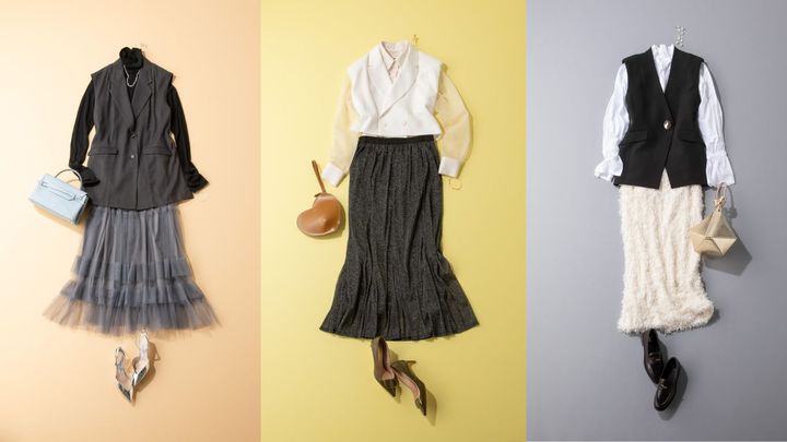 この秋冬も引き続き、チュールやキラキラなど心惹かれるドラマチックなスカートが豊作です。ただ、40代が着るとどうしても甘すぎ・盛りすぎになっていないか心配に。そんなときにもやっぱり頼れるのがジレ。甘さや盛り具合を程よくOFFしオシャレにまとめてくれます。今回はトレンド好きSTORYライターが今季挑戦してみたいと思っているスカート別に、STORYスタイリストに最適なジレを教えてもらいました!