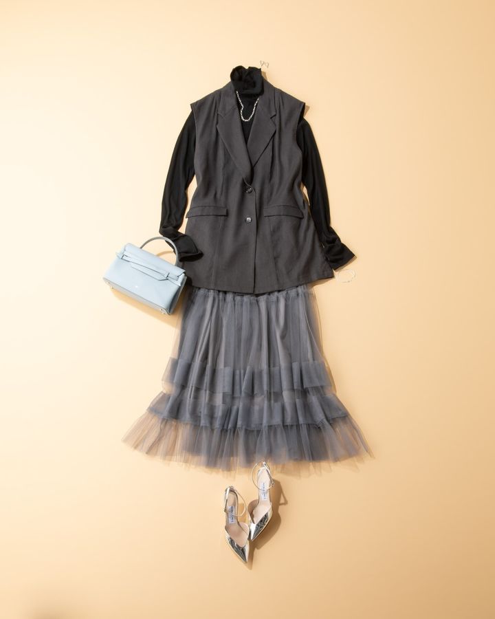 甘代表のチュールスカートもジレ合わせなら<オフィスシーン>でも違和感ナシ!